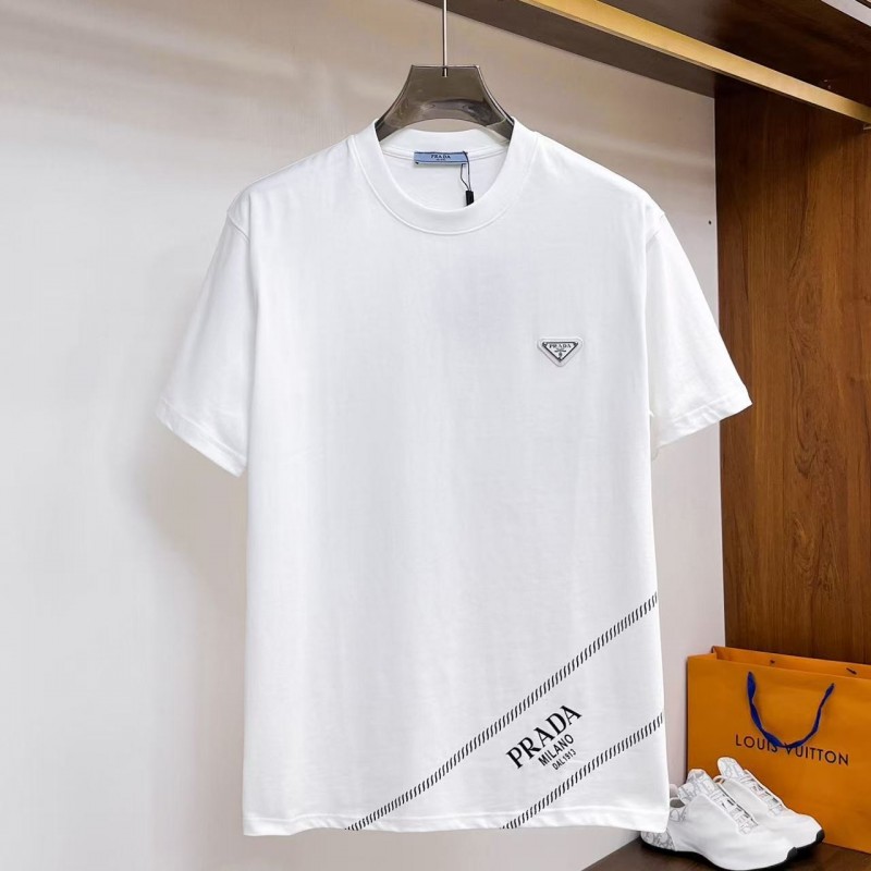 Pra*a SpringSummer White Pocket Letter Leather Fusion Metal Triangle Logo T-shirt